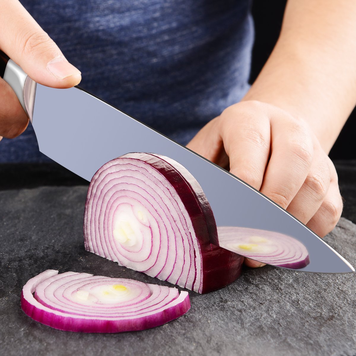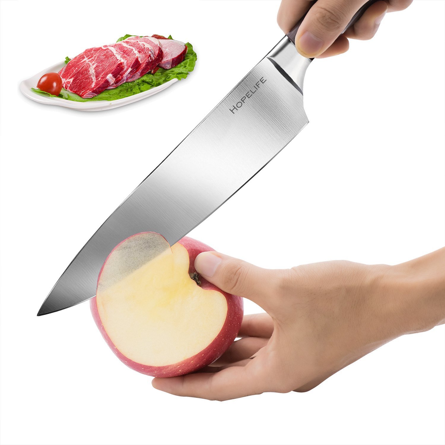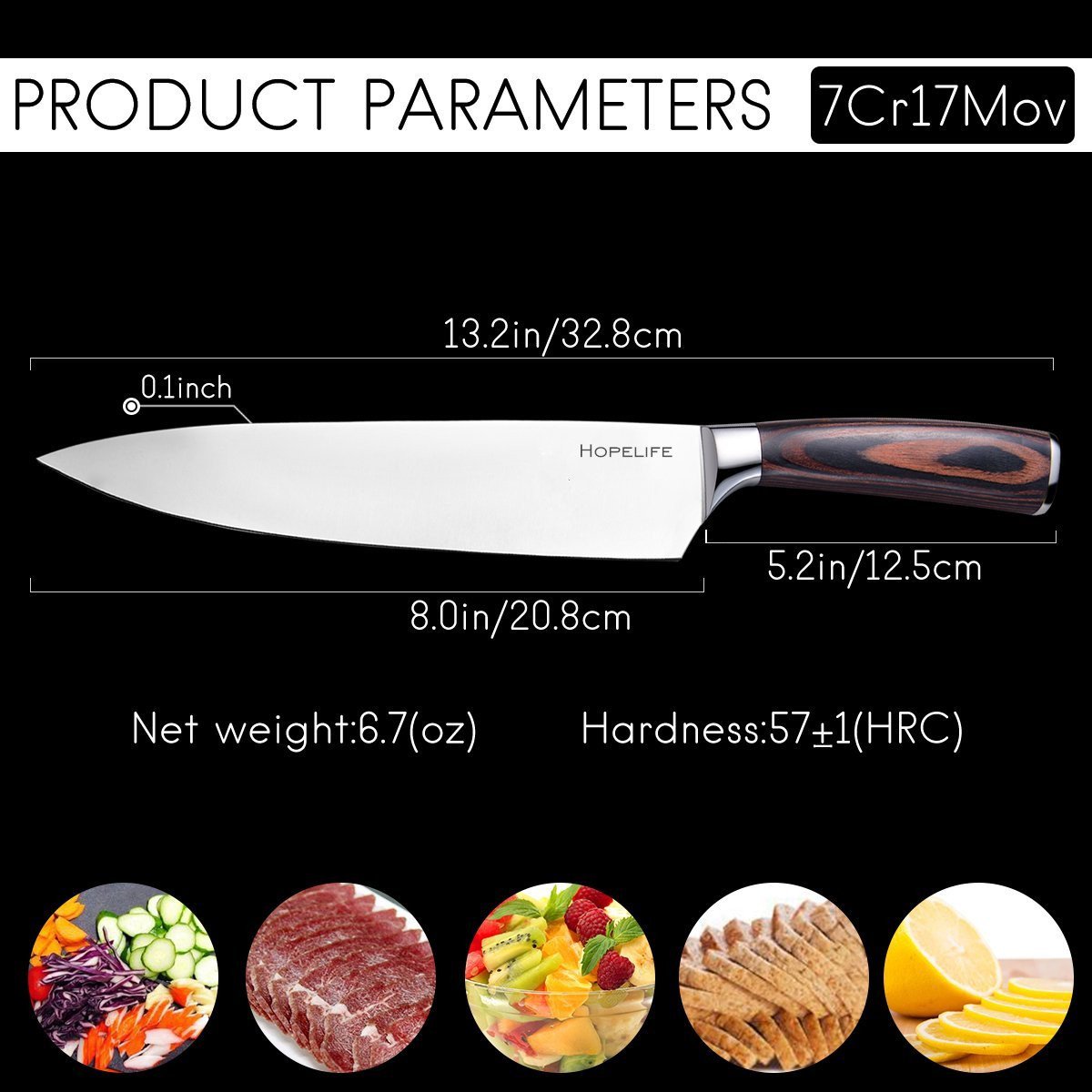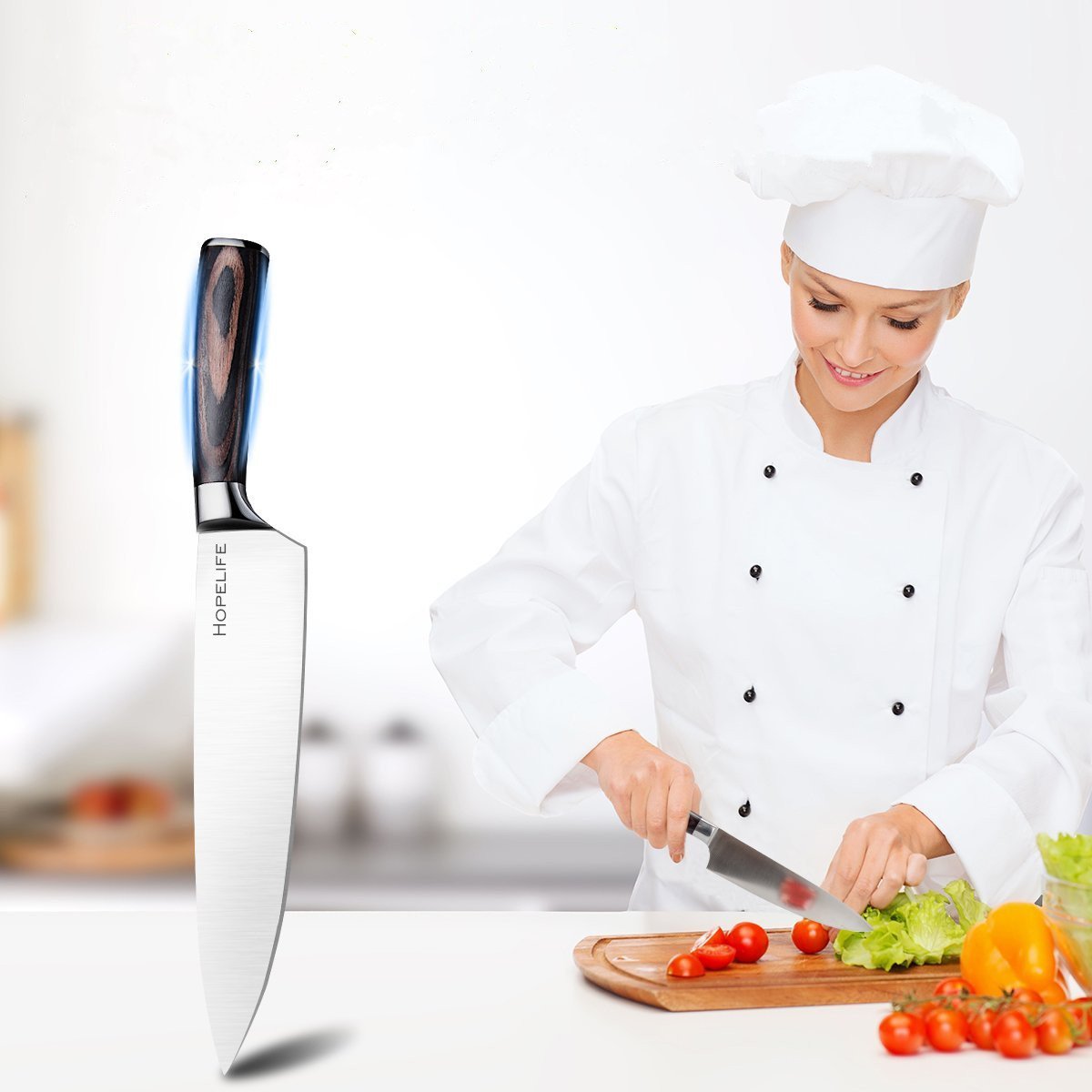 - Hopelife 8 インチシェフナイフは一般の方を含むシェフや料理専門家、仕出しといったプロ向けのデザインです。