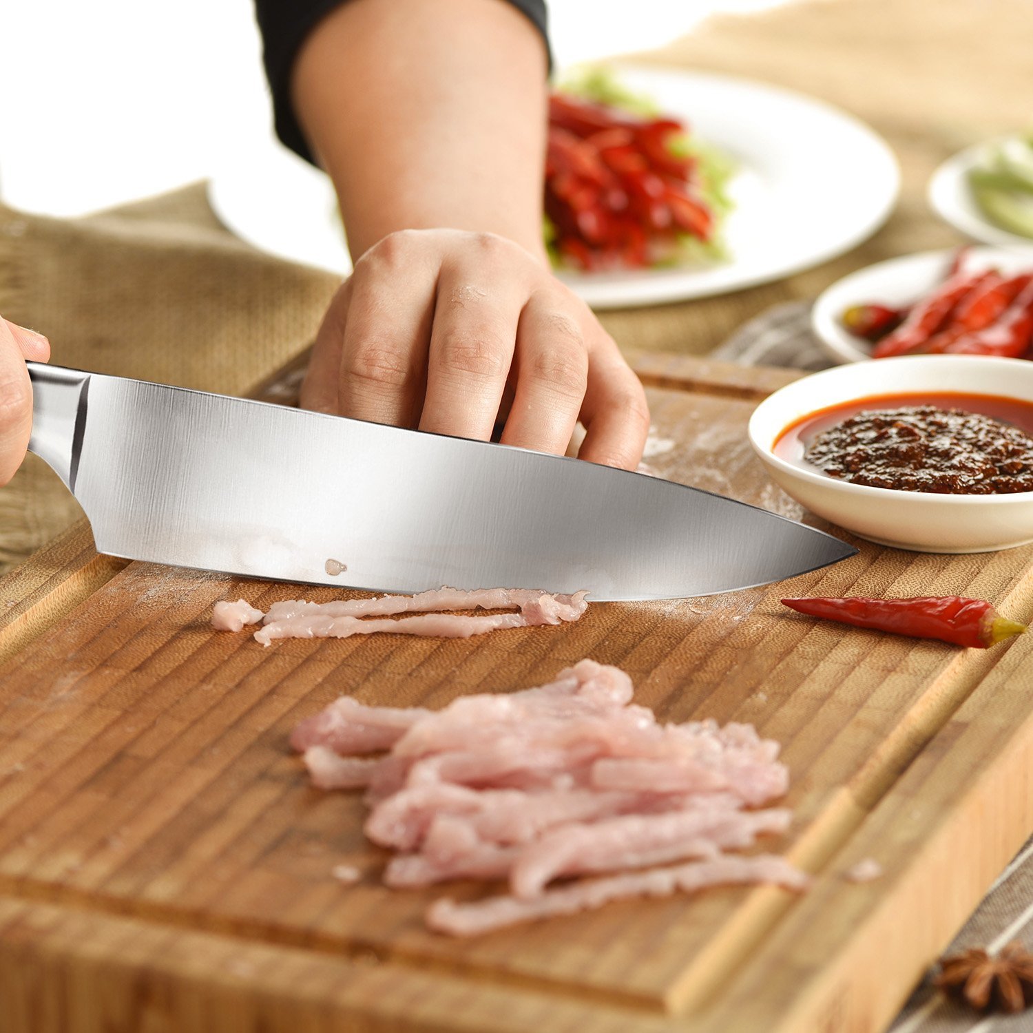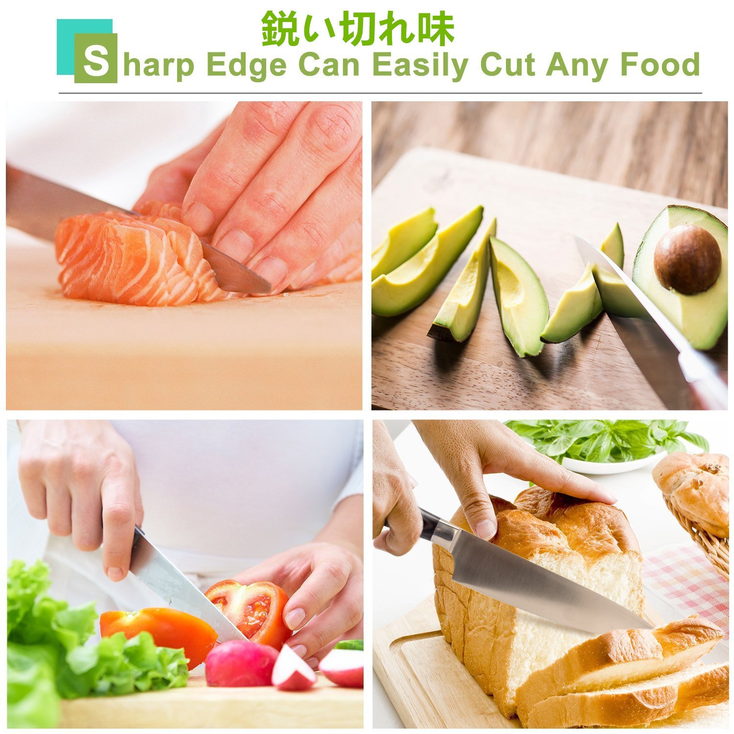 堅牢性、耐摩耗性、靭性、硬度を備えた高級ステンレス包丁、プロ仕様です。耐摩耗性に優れ、心地よい切れ味が長く持続します。肉や魚、野菜などの食材に対応、軽いタッチできれいにカットできる。切れにくいカボチャでもこちらのシェフナイフを使えばスパスパに切れます。家庭でも「料理人のような切れ味」のステンレス包丁です。
