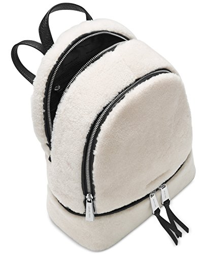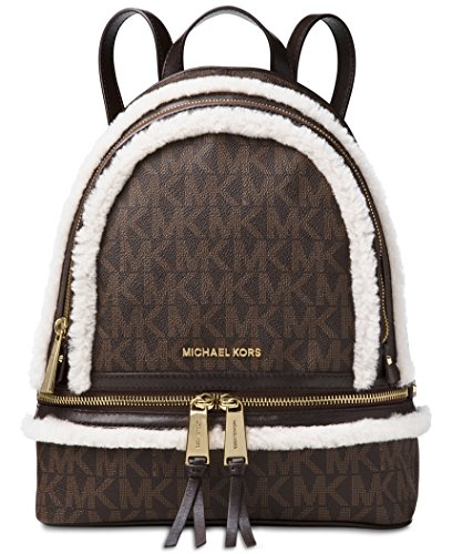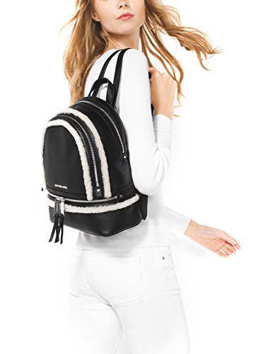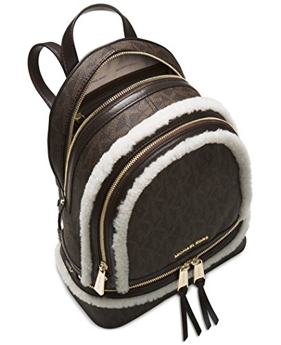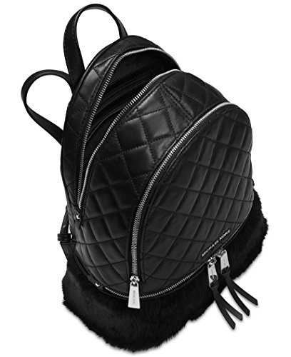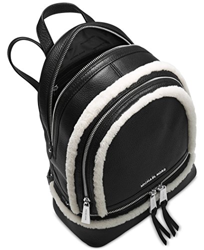 -. Brand : -. Color : Black -. Department : womens -. Feature : Double compartments with zip closures / Interior features 1 zip pocket, 3 open pockets and key clip / Exterior features gold-tone hardware, genuine fur trim and 2 front zip pockets / 2-1/2"L top handle; 12"L backpack straps / Medium sized bag; 9"W x 13"H x 5"D -. Label : -. Manufacturer : -. Model : MKMRZSB1311611 -. MPN : MKMRZSB1311611 -. PartNumber : MKMRZSB1311611 -. ProductGroup : Shoes -. ProductTypeName : HANDBAG -. Publisher : -. Size : Medium -. Studio : -. Title : MICHAEL Rhea Zip Medium Fur Backpack