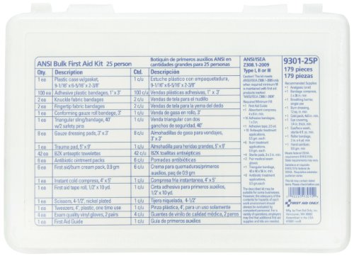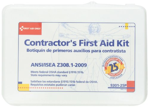 -. Binding : Health and Beauty -. Brand : First Aid Only -. EAN : 0092265930154 -. Feature : Great variety of first aid supplies that are easy to locate and use / Quality, hospital grade first aid supplies / Proudly made in the USA by American workers -. IsAdultProduct : 0 -. Label : First Aid Only -. Manufacturer : First Aid Only -. Model : 9301-25P -. MPN : 9301-25P -. NumberOfItems : 1 -. PackageQuantity : 1 -. PartNumber : 9301-25P -. ProductGroup : BISS -. ProductTypeName : HEALTH_PERSONAL_CARE -. PublicationDate : 2013-07-15 -. Publisher : First Aid Only -. ReleaseDate : 2013-07-12 -. Studio : First Aid Only -. Title : First Aid Only Contractor's First Aid Kit, Plastic, 1.7 Pound -. UPC : 092265930154