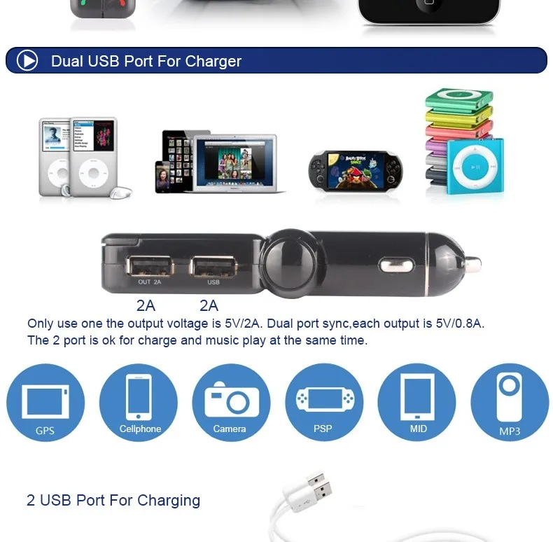 Description:This product is blue-tooth car charger mp3 player for vehicle. Adapting professional-grade high-performance bluetooth module, built-in mp3 decoder chip make it capable of playing the music files in u disk, firing into the car stereo via wireless. Besides, during the bluetooth connecting, play the phone’s music and FM transmitter to Car Audio, as the calls incoming automatically switches to the speaker state, call end then automatically back the music player. So you do not do any modifications, easily enjoying the music and handsfree phone calls while you are driving.