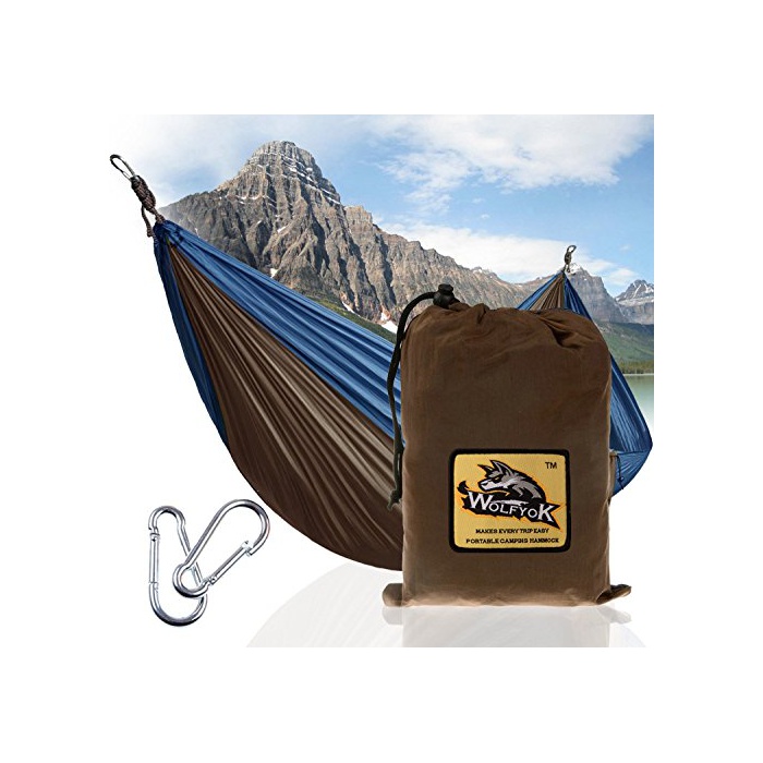 해먹(hammock) (2명 용) Wolfyok(TM) 파라슈트 해먹(hammock) (140*290cm) 경량 와이드 로프+카라비너+수납 봉투 첨부 캠프 아웃도어 블루&브라운
