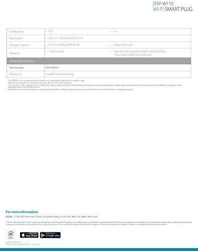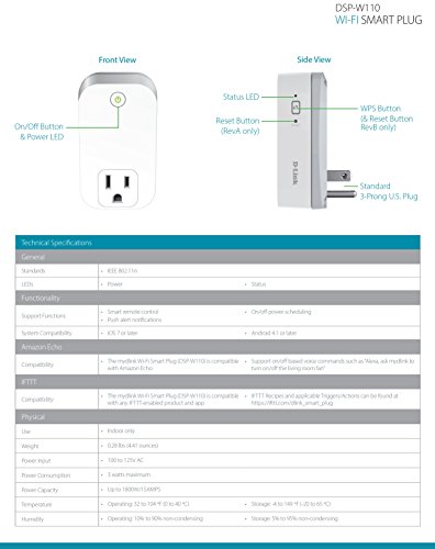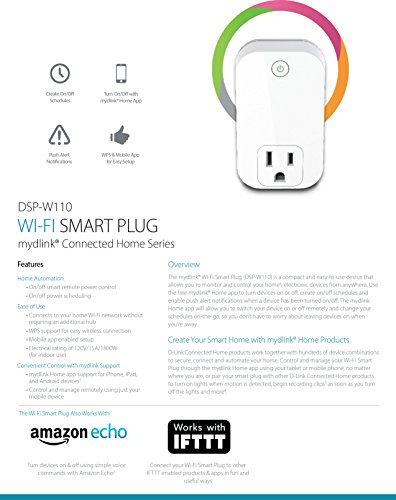 The mydlink Wi-Fi Smart Plug (DSP-W110) is a multi-purpose, compact, and easy-to-use device that allows you to turn your devices on/off. Using the mydlink app you can create on/off schedules for your home's electronic devices.