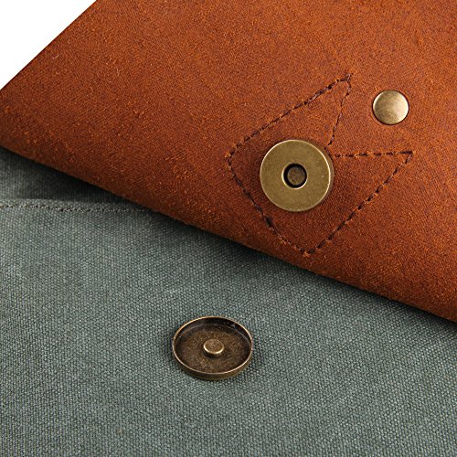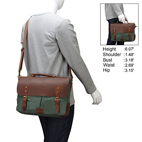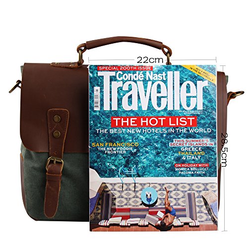 - Feature : Made of high density canvas and genuine leather / Retro style design, well sewn craftsmanship / Ample room for iPad, A4 size files and other necessities / Bronze-tone buckles detail, durable top handle and adjustable shoulder strap for easy carrying / Approx. Dimensions: 14.2''L x 3.9''W x 11.0''H