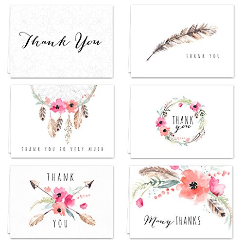 -. Title : Boho Spirit Thank You Card Assortment Pack - Set of 36 cards blank inside - 4 designs blank inside - with white envelopes