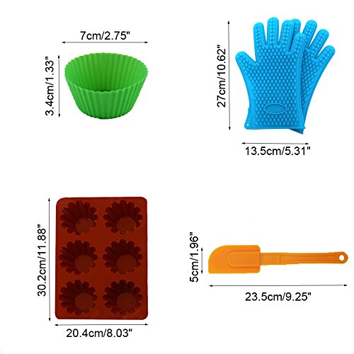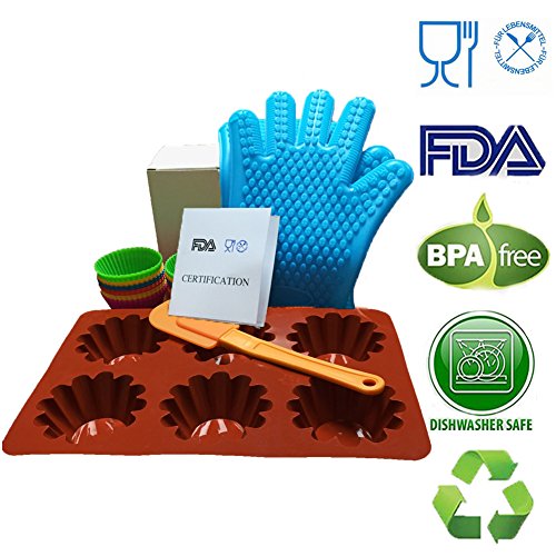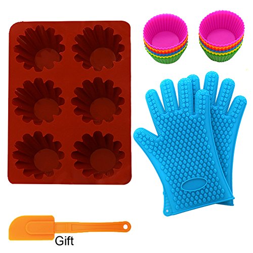 - DURABLE&REUSABLE&MULTIFUNCTIONAL: made of 100% food grade silicone, use in Oven, Microwave, Freezer, Dishwasher. The muffin pan & cupcake Liners for muffin, chocolate, jelly and so on, non-stick and reusable, environmentally friendly. The gloves for baking, grilling, BBQ, cooking and cleaning. The spatula for stir, spread and cutting.