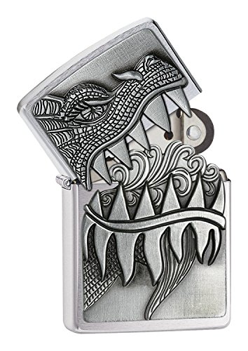 Look out! This Brushed Chrome dragon design features an attached emblem and a surprise - open the jagged teeth to reveal a fiery cloud of flame. Comes packaged in an environmentally friendly gift box. For optimal performance, use with Zippo premium lighter fluid.; for optimum performance of every Zippo windproof lighter, we recommend genuine Zippo premium lighter fluid, flints, and wicks.Feature