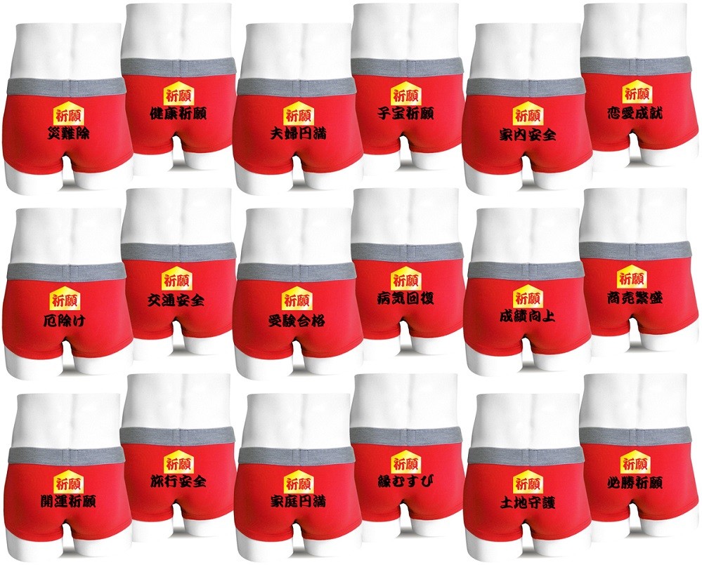 なんと!18種の祈願を選べるボクサーパンツです。縁起の良い赤パンツに豪華金色絵馬にある祈願文字!!陰ながら応援する我が子の受験にも良し、いつも仕事を頑張るお父さんへのお礼にも良し、自分への願掛けとしての勝負パンツとしても良し!!あなたの祈りきっと届くはず・・・頑張って!!