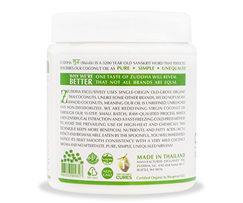 UNAPOLOGETICALLY EXCELLENT: Zuddha is certified USDA organic, extra virgin, vegan, raw-qualified, kosher, non-gmo, bpa-free, ethically sourced, humane work environment & free from peanuts, nuts, dairy, soy, eggs, fish, wheat, gluten, bleach, pesticides and hexane.