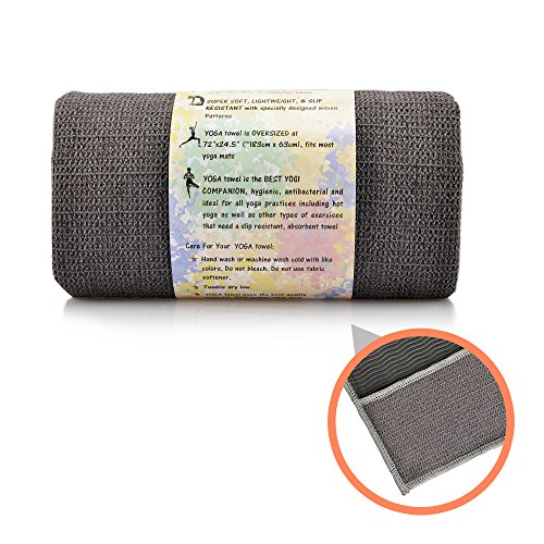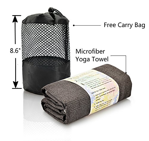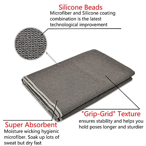 Feature : INNOVATIVE MICROFIBER AND SILICONE MATERIAL - Utilizing the latest fabric technology to outperform all other yoga towels, the New Generation yoga towel features a lint-free, moisture-wicking microfiber and silicone bead composition. Lightweight, comfortable, and available in chic gray, it is hygienic and mold-resistant / SUPER ABSORBENT TO SOAK UP SWEAT - Antimicrobial and antibacterial, this yoga towel with silicone beads holds up to 4x its weight in water yet dries 12x faster than a standard cotton or polyester towel. Perfect for use during Hot Yoga, Power Yoga, or Bikram Yoga classes when your perspiration levels are highest / ANCHOR-FIT CORNERS - Offering exceptional stability with no bunching up, this premium microfiber yoga mat is non-skid and has a unique grip-grid texture with a silicone bead coating. The tiny beads cause no discomfort but help you hold yoga poses more steadily for longer. Measuring 72 x 25 inches, this skidless yoga towel is totally versatile; use as a non slip mat or whole body towel / NO MORE WET TOWEL SMELL - Simply hand or machine wash and air or tumble dry to keep the washable yoga mat towel fresh. Compact and easy to store it comes with a free carry bag, making it portable for travel to and from yoga class / 100% MONEY-BACK GUARANTEE - If you are not completely satisfied with this revolutionary microfiber yoga towel then return it to us for a full refund
