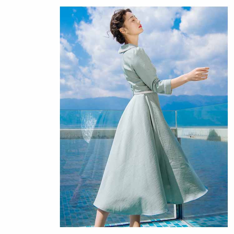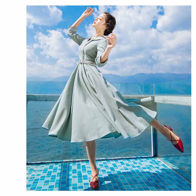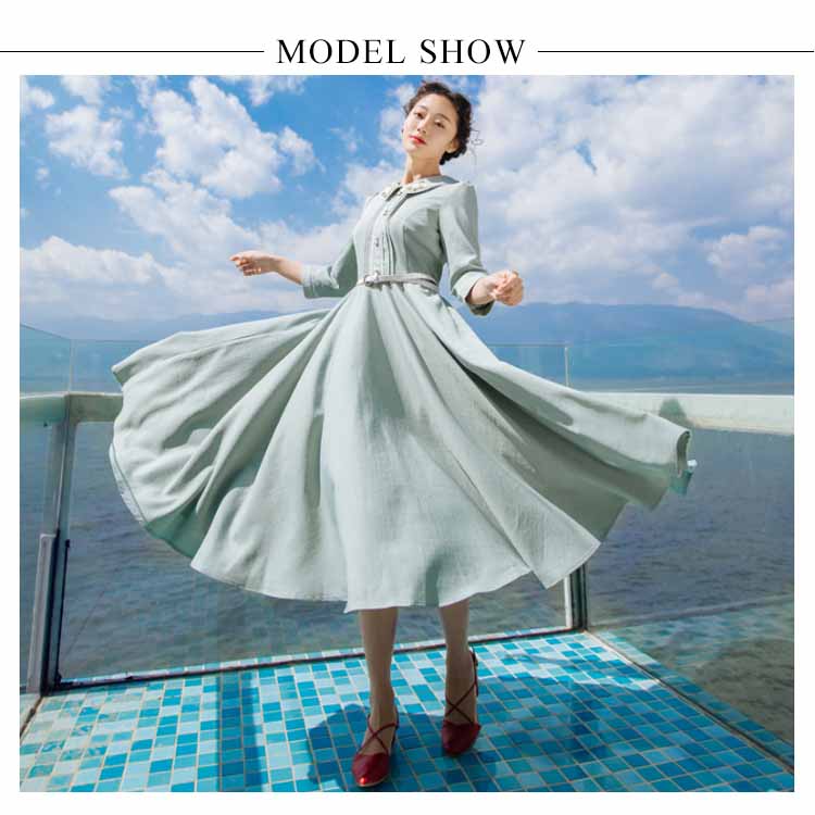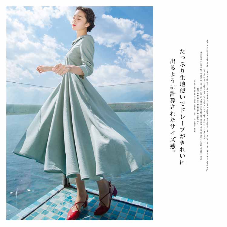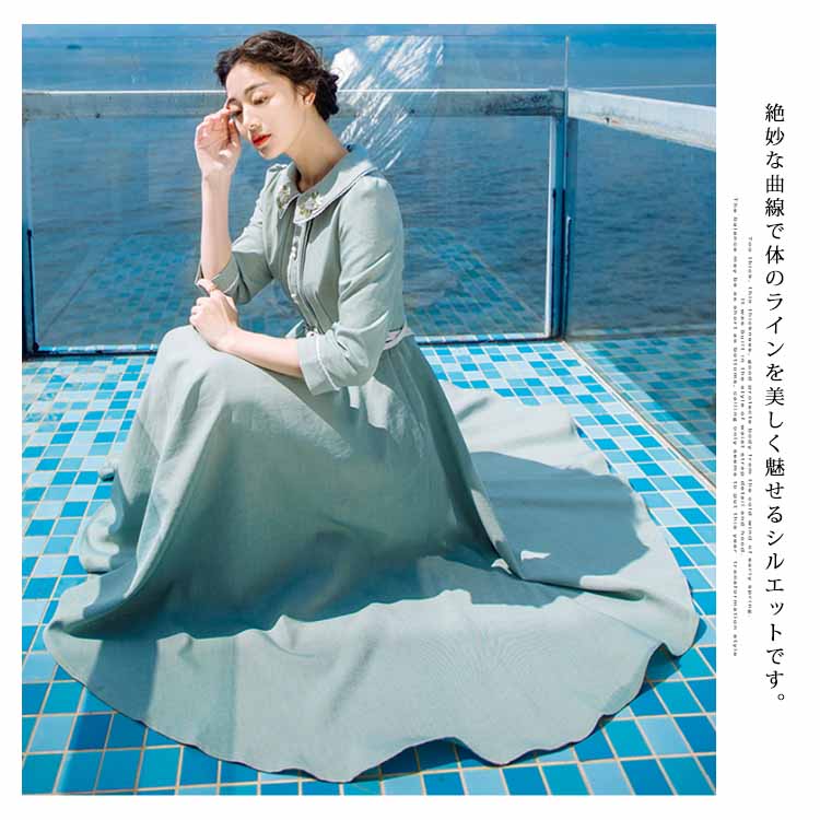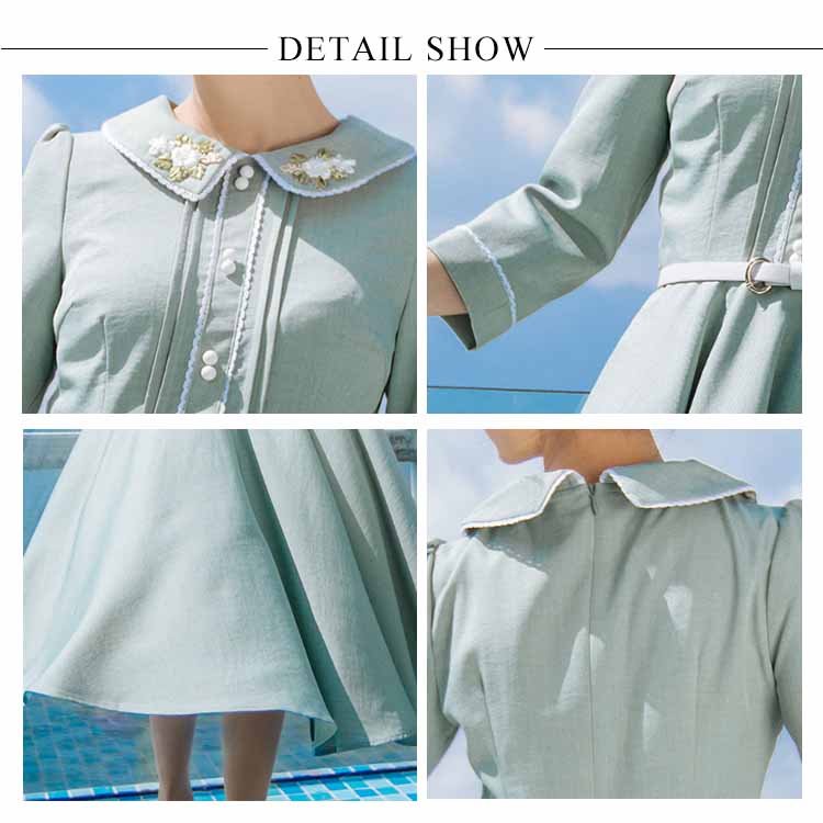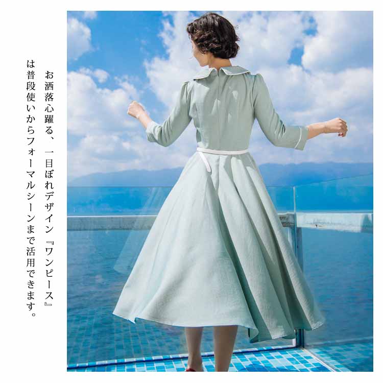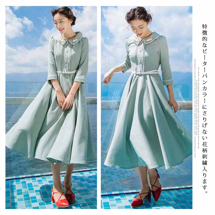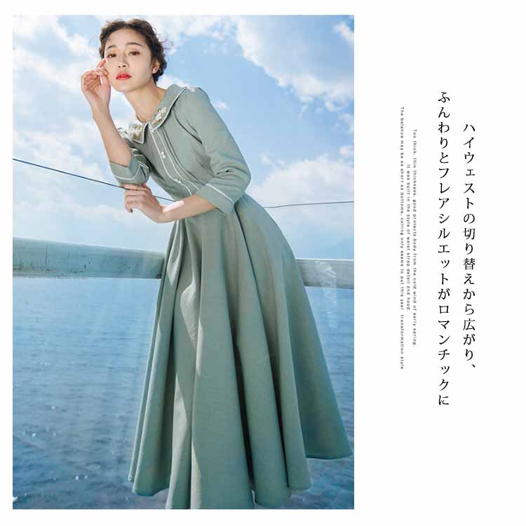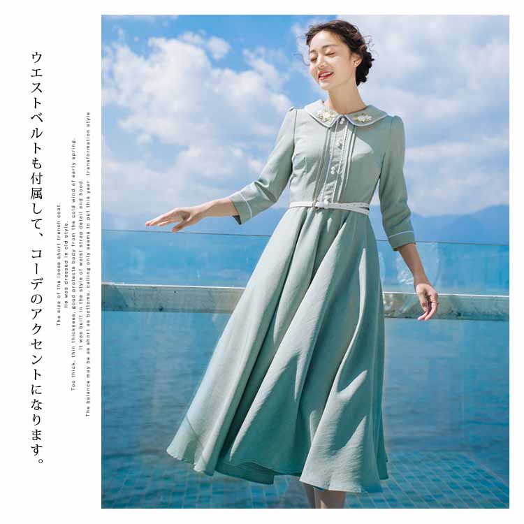 | 今季イチオシのミモレ丈七分袖ワンピース。特徴的なピーターパンカラーにさりげない花柄刺繍入ります。ハイウェストの切り替えから広がり、ふんわりとフレアシルエットがロマンチックにウエストベルトも付属して、コーデのアクセントになります。絶妙な曲線で体のラインを美しく魅せるシルエットです。たっぷり生地使いでドレープがきれいに出るように計算されたサイズ感。お洒落心躍る、一目ぼれデザイン『ワンピース』は普段使いからフォーマルシーンまで活用できます。 | |