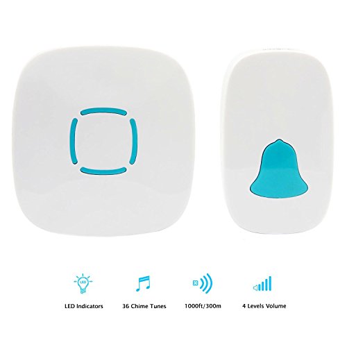-. Feature : 1.Transimission Range Up to 280 meters (Approx 1000-feet) in the open air,signals can pass through several walls(specific effects depend on surroundings and thickness of walls),whether you are busy working on your computer in the home office or sharpening your culinary skills in the kitchen, you will always be easily informed when someone pressing the push button. / 2.Made of IP44 waterproof material and acceptable for outdoor use.Our wireless doorbell is safe for outdoor use.No radiation, kids, pregnant woman, old man, both of them can feel relieved the use. Ultra low power design, energy conservation and environmental protection, easily plug receiver into an electrical outlet (no batteries required for main receiver),maximum power just is 2W, standby power is 0.5W. The transmitter battery can be used for over 15 months FCC, RoHS certified. / 3.Sound options: 32 chimes,36 Polyphonic melodies included for all people to choose;Volume: 4 levels Volume adjustable from 20db to 80db,will give you complete control over the sound of your door chime. Good option for nap time without disturbing your infant or young child when they are asleep. / 4. Point touch operation, can increase of service life.Shaping by the newest ABS material, non poisonous and tasteless, cold-resistant and heat-resistant. Dust proof panel, effectively prevent dust, and easy to clean, make your perfect doorbell free from dust / 5.Easy Installation Without Damaging The Wall & Low Power Consumption - With alkaline battery, the transmitter can be mounted with the adhesive tape without damaging the wall. Or for a more secure fix, screws can be fixed through the knock outs on the base of the transmitter. The receiver can be plugged into an electrical outlet in your home. When pressing the transmitter, the blue flashing light indicator gives you a visual form of notification. Low power consumption helps you save energy.