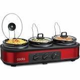 Triple Slow Cooker 1.5-qt. capacity in each measures 22"x10.2"x6.7"H 3 temperature settings include low, high and warm nonskid feet prevent spills individual temperature controls stoneware pot/tempered glass lids dishwasher safe imported