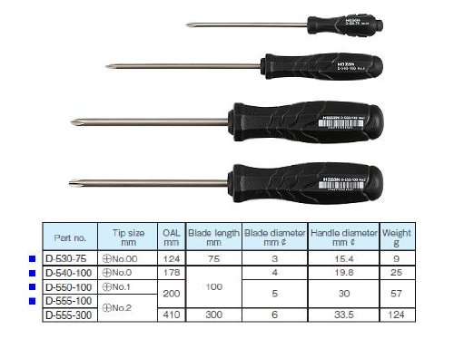The D-530-75, D-540-100, D-550-100 and D-555-100 drivers have replaced the previous generation (D-130-75, D-140-100, D-150-100 and D-155-100 drivers) J.I.S.(Japanese Industrial Standard) tips are slightly different than those Phillips tips typically found in the U.S. All Phillips screws are not the same. If you experience cam-outs, or find that you are ripping and damaging screwheads, you are probably using a US Phillips screwdriver, when you should be using a JIS screwdriver. As JIS screws become more popular, the best way to reduce cam-outs and/or ripping out screwheads, is to purchase JIS screwdrivers.Feature