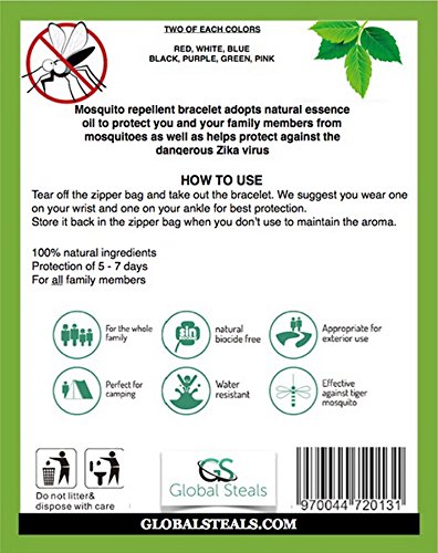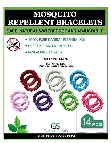 -. Brand : Global Steals -. EAN : 0793945310005 -. Feature : 14 - Pack of Mosquito bracelets. NO DEET, NO MESS, NO BOTTLES and NO OILY SKIN - All Natural Essential Plant Oils - No Spray aerosols with toxic artificial chemicals, these ultimate pest repellent wrist angle bands are DEET free and naturally repels mosquitoes. / GET PREPARED TO FIGHT MOSQUITOES. Our Waterproof Pest Repellers are a great addition to all outdoor backpacks and picnic basket sets to keep nasty pests off you and your family. / ESSENTIAL REPELLENT TOOL Fits kids and grown ups, will not fall off, great for any indoor and outdoor, garden activity. / OUR FAMILY PACK of 14 PIECES gives you control and protection of insects and other pests with pleasant smelling scents of geraniol, lemongrass and citronella. Great for Camping, Campers, Traveling, Concerts, Parks and Yard. / RESEALABLE ECO-FRIENDY SINGLE PACKAGES - STAYS EFFECTIVE for 3 YEARS Unopened reserves each refill effectiveness while not in use to extend lifespan of 250+ hours/band i.e. 2500 hours per set. Help prevent bites from Mosquitos that can carry Malaria, West Nile virus, Elephantiasis, Dengue Fever, Yellow Fever. -. Label : EVA -. Manufacturer : EVA -. MPN : GL009 -. PackageQuantity : 14 -. PartNumber : GL009 -. ProductGroup : Lawn & Patio -. ProductTypeName : OUTDOOR_LIVING -. Publisher : EVA -. Studio : EVA -. Title : 14 Pack of Anti Mosquito Silicone Bracelets ★DEET Free Mosquito Insect Repellent Wristbands ★2 of each color packed separately (Red, White, Blue, Light Pink, Purple, Green & Pink) -. UPC : 793945310005