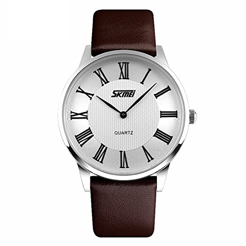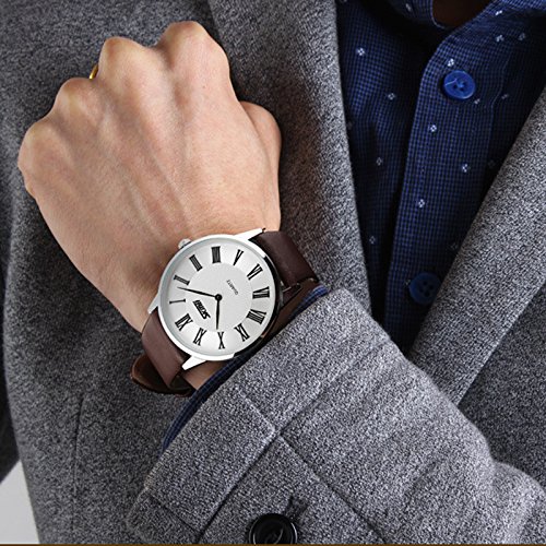 -. Title : CakCity Men's Roman Numeral Stainless Steel Quartz Analog Wrist Business Watch With Brown Leather Strap