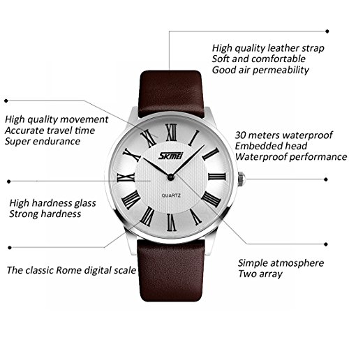 -. Feature : Classic Design: With leather darker than the deepest parts of the ocean, the classic style was carefully designed to stand the test of time while maintaining its effortless beauty. This minimalistic piece proves that simple does not necessarily mean boring. / Durable: stainless steel water proof case cover, soft PU leather watch band provide comfortable wearing experience. / Movement: Citzen Japanese Quartz Movement, precise quartz movement for accurate time keeping. / Convenient and comfortable: Stainless steel clasp, free buckle, easy to put on or take off. / Water resistant to 30 m (99 ft): In general, withstands splashes or brief immersion in water, but not suitable for swimming.