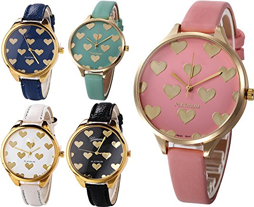 Yunanwa 5 Pack Wholesale Women's Heart Painted Leather Watches Assorted Platinum Wristwatches