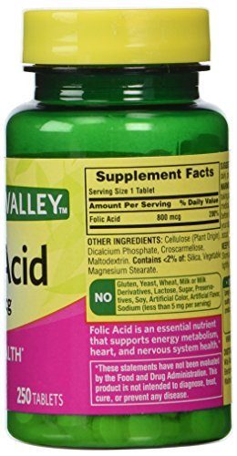 -. Binding : Health and Beauty -. Brand : Spring Valley -. EAN : 0681131697088 -. Feature : Plays an important role in the synthesis of several types of amino acids. / Needed for energy production. / Essential in the formation of red blood cells. / Important in cell division, replication, and protein synthesis. / Strengthens immunity. -. IsAdultProduct : 0 -. Label : Spring Valley -. Manufacturer : Spring Valley -. Model : Spring Valley -. MPN : Spring Valley -. PartNumber : Spring Valley -. ProductGroup : Health and Beauty -. ProductTypeName : HEALTH_PERSONAL_CARE -. Publisher : Spring Valley -. Studio : Spring Valley -. Title : Spring Valley - Folic Acid 800 mcg, 250 Tablets -. UPC : 681131697088