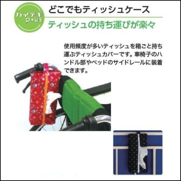 使用頻度の多いティッシュを箱ごと持ち運ぶテイッシュカバーです。車イスのハンドル部やベッドのサイドレールに装着できます