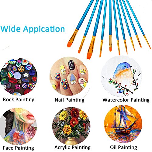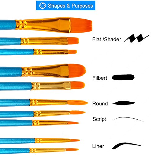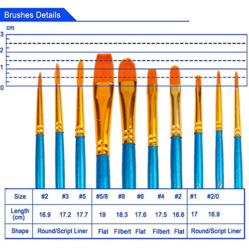 - 10 ARTIST PAINT BRUSHES : This art paint brush set contains a variety of size (5/8 8 6 4 5 3 2 2 1 2/0) and shapes( filbert, round, flat, angle, liner). It will meet your different painting needs: Acrylic, Oil, Watercolor, Rock painting, Face painting, Nail art, Child's art project, Craft projects, Canvas projects, Wood sign, sculpt figurines, body, miniature, ceramic, leather, gesso.