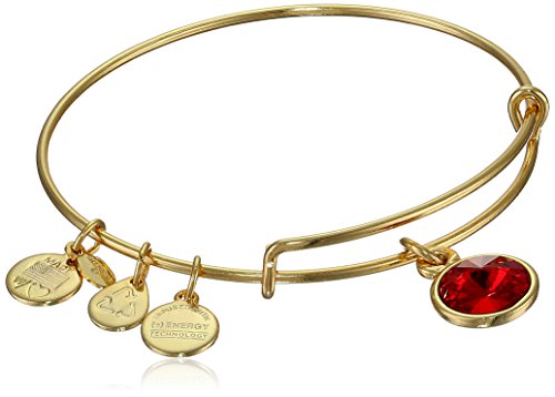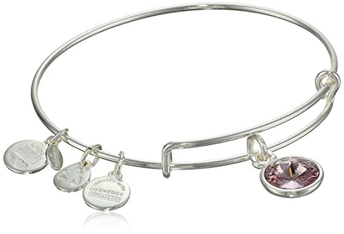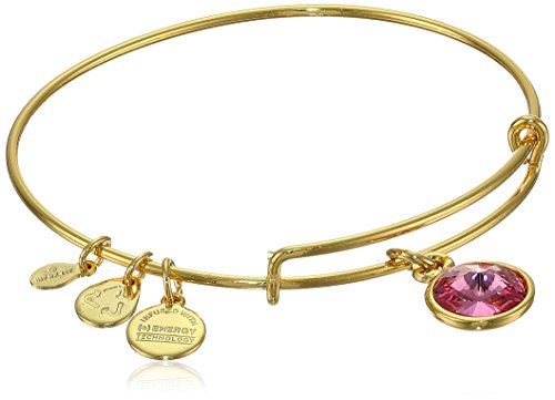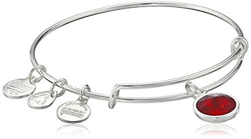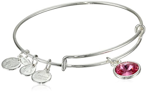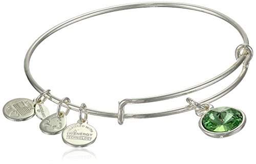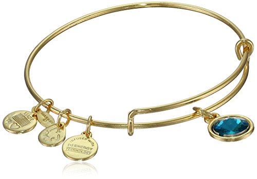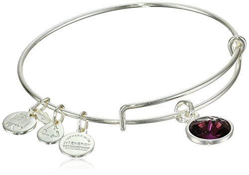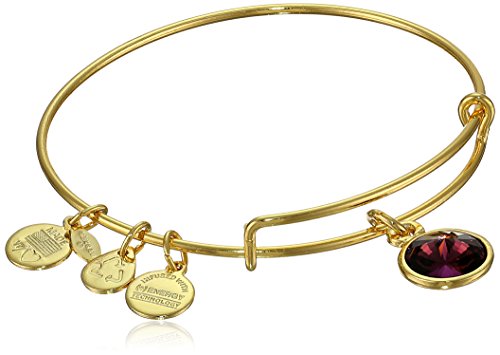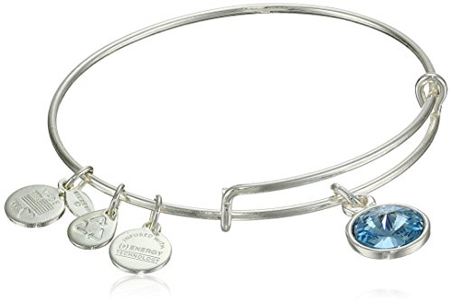 Handmade bangle bracelet crafted from recycled material and featuring faceted birthstone and three stamped Alex and Ani charms