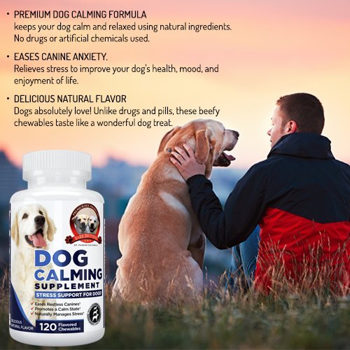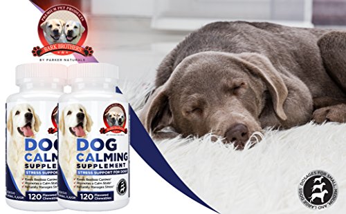 SUPERIOR DOG CALMING FORMULA by Parker Naturals Bark Brothers is the ultimate natural supplement to calm and relax dogs. If your pet is barking all the time, pacing back and forth nervously, or misbehaving because of stress; this excellent natural supplement helps ease anxiety, calms your dog, and naturally relieves stress. This not only helps your dog behave, it improves his or her health, and improves your dog's quality of life. HIGHLY BENEFICIAL NATURAL NUTRIENTS like 200mg of Glucosamine HCL, 75mg of Vitamin C, and 50mg of Organic Turmeric plus other vitamins, herbs, and minerals. This creates Extra Strength Stress Support for Dogs. Giving your dog a chewable each day will naturally calm and relax. This improves your dog's health, supports wellness, prevents sickness, and helps stop nervous behaviors. NATURALLY SOOTHES CANINES. One of the biggest problems for dogs is stress. In modern life when they often have to stay at home alone for many hours, stress can build over time. It's often hard to tell that your dog is stressed, but untreated anxiousness can severely damage your dog's health and enjoyment of life. This premium natural Dog Calming Formula lets you relax your dog without drugs. 100% MONEY BACK GURANTEE makes this your best bet for a no-risk purchase. Many customers love this product so much they return to buy 2 or 3 more bottles. HURRY AND BUY NOW while we have a new shipment in stock. This makes a much appreciated gift for friends, family, and co-workers.Feature
