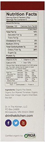 -. Binding : Grocery -. Brand : Doctor In The Kitchen -. EAN : 0893615002039 -. Feature : Gluten free / High in Omega 3s / Raw -. Label : Doctor In The Kitchen -. Manufacturer : Doctor In The Kitchen -. MPN : 893615002039 -. NumberOfItems : 1 -. PackageQuantity : 1 -. PartNumber : 893615002039 -. ProductGroup : Grocery -. ProductTypeName : GROCERY -. PublicationDate : 2012-04-26 -. Publisher : Doctor In The Kitchen -. Studio : Doctor In The Kitchen -. Title : Doctor In The Kitchen Flaxseed Crackers, Tomato Basil, 5-Ounce -. UPC : 893615002039