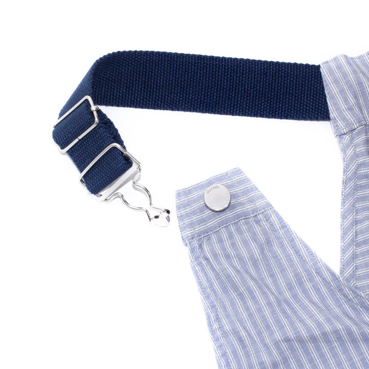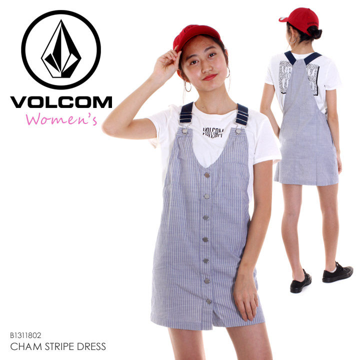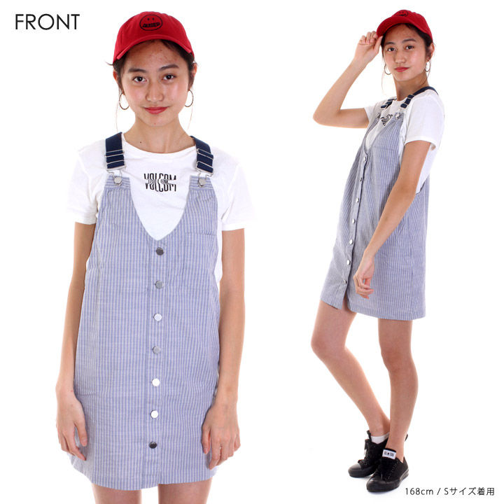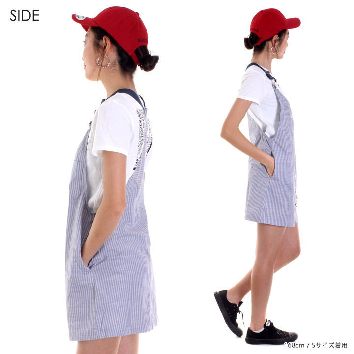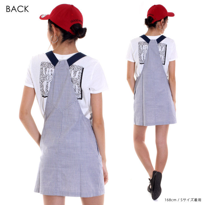 爽やかなホワイトxブルーのストライプ柄で春夏コーディネートにオススメのオーバーオールスタイルのワンピース。体のラインをキレイに見せてくれるディテールで、フロントにはロゴを刻印したメタルボタンを施し、着脱もしやすい仕様。また、胸ポケットや両サイドにもポケットが設けられ、見た目以上の使勝手の良い着用感が楽しめます。トレンドのカーブバイザーキャップと合わせたスポーツミックスのスタイリングにベストマッチ!!