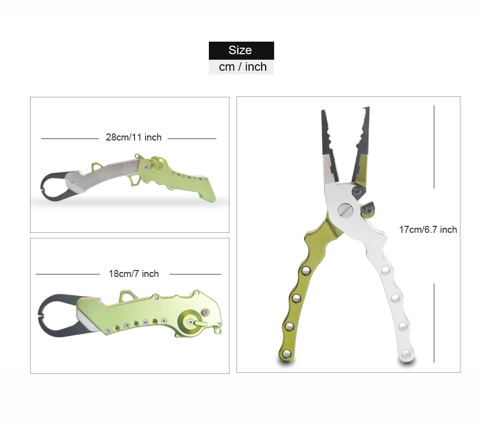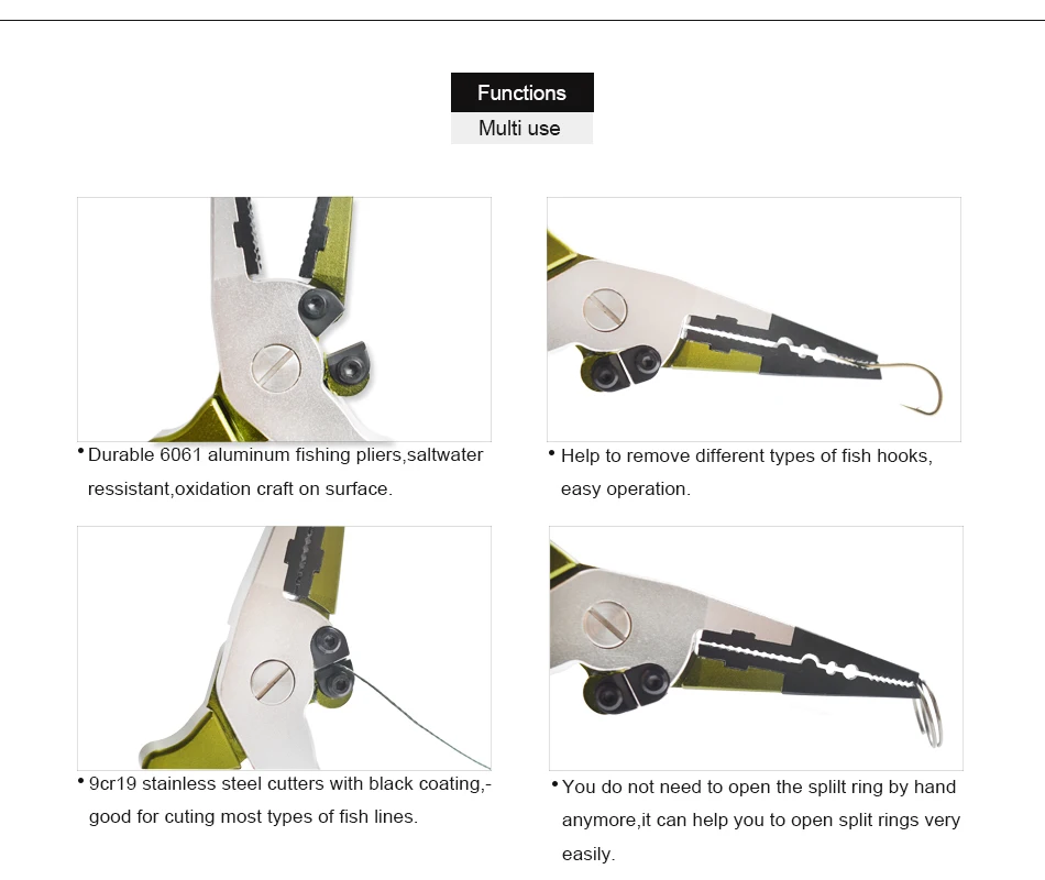 Functions:Braid line cutter,split ring opener,hook romover,catch fish