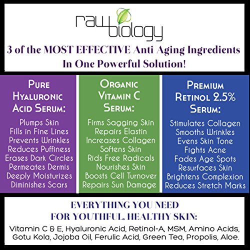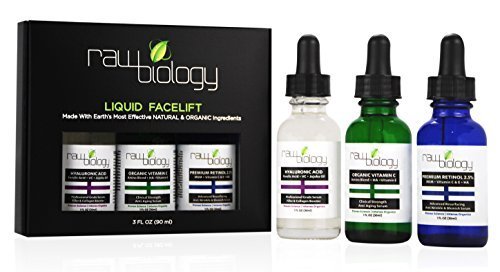 HIGHEST FORM of active bio-available Vit C RECOMMENDED BY Dermatologists to take up to 10 years off your face. MADE IN USA. NO Parabens, NO Alcohol, NO Sulfates. The Liquid Facelift System has been extensively researched and is precisely formulated to give extreme results, fast. Overlapping ingredients to give deep repair when used in unison and formulated to be used individually for healthy skin maintenance and prevention. The system is used as a: Resurfacing Treatment, Wrinkle Filler, Collagen Builder, Acne Treatment, Acne Scar Removal Treatment, Psoriasis Treatment, Skin Resurfacing and Post Laser Treatment. The All-in-1 is able to replace your best face creams, as well as harsh, expensive Retin A and Retinol Creams. Raw Biology's System Utilizes the 3 Most Powerful Anti Aging Serums: Pure Hyaluronic Acid Serum that Plumps Skin, Prevents Wrinkles, Fills in Fine Lines, Reduces Puffiness, Erases Dark Circles, and Deeply Moisturizes. Organic Vitamin C: Firms Sagging Skin, Repairs Elastin, Rids Free Radicals, Increases Collagen, Softens Skin, Boosts Cell Turnover, Nourishes Skin, Repairs Stretch Marks. Premium Retinol 2.5%: Stimulates Collagen, Smooths Wrinkles, Evens Skin Tone, Fades Age Spots, Fights Acne, Brightens Complexion, Resurfaces Skin, and Softens Scars. Raw Biology's Organic Skincare products are guaranteed or your money back.Feature