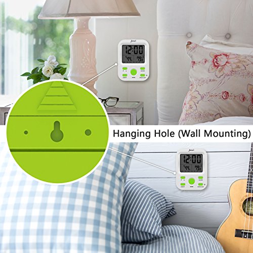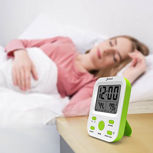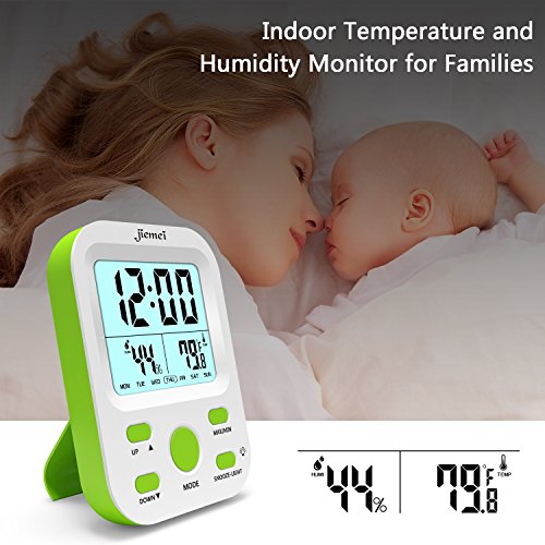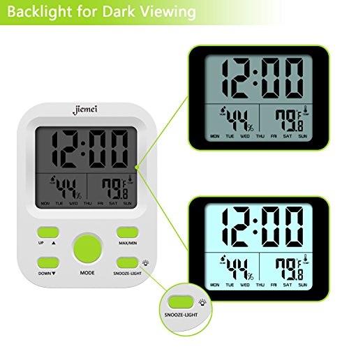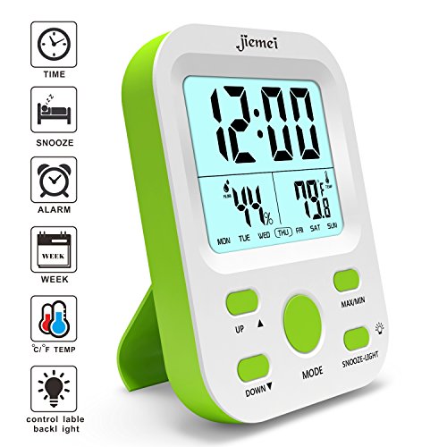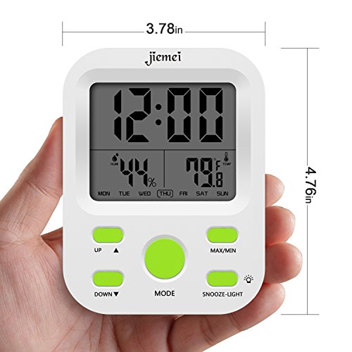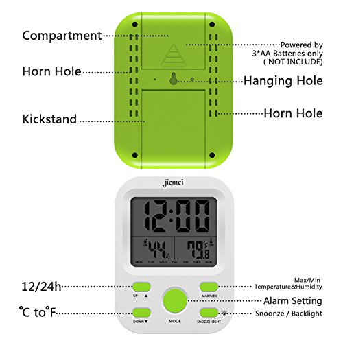 Studio : jiemei Publisher : jiemei Binding : Kitchen Product Description [MULTI-FUNCTION]: Jiemei travel alarm clock designed with large LCD display show Time/Calendar/Temperature/Humidity and unique shell frame, flexible application for desktop standing or wall mounting, shift 12/24 hour format and °F/°C switchable with front buttons, operated by 3 pieces of 7th AAA batteries which are Not included in the package. [GENTAL SOUND SNOOZE FUNCTION]: Our home alarm clock starts out soft and gets progressively louder for 2 minutes until you turn it off. The alarm sounds again after 8 minutes in snoonze mode, the sounds can be stopped by press any button. [SMART and MANUAL BACKLIGHT]: our digial alarm clock can light up automatically in dark with soft nightlight which will not too bright to affect sleeping. And the backlight can be also turned on by pressing " Snooze" button whether dark or daylight which can just last for 8 seconds. [INDOOR TEMPERATURE HUMIDITY MONITOR]: The clock displays real-time temperature and humidity, record the highest and lowest data everyday, the data will be deleted automatically at 0.00 everyday. And temperature range is -9.9~ 60℃(14.2~ 140 F), humidity range is 20 ~ 99%RH. 0