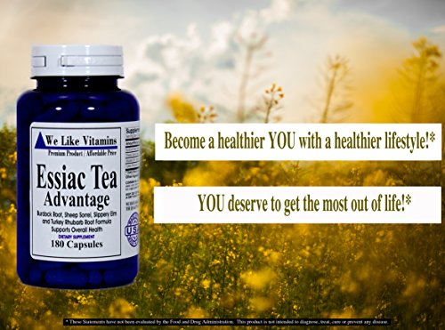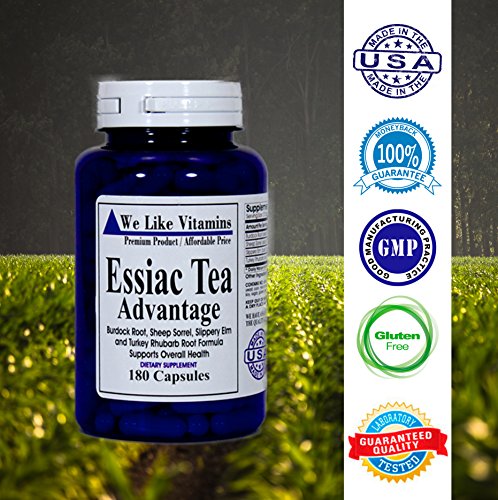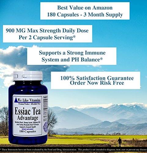 BEST VALUE Essiac Tea Capsules on Amazon -180 Capsules- 3 month supply – Each bottle contains 180 Capsules of Essiac Tea for a full 90 day supply. Most others offer half the pills at half the strength. With We Like Vitamins Essiac Tea Advantage you buy fewer bottles and save money.