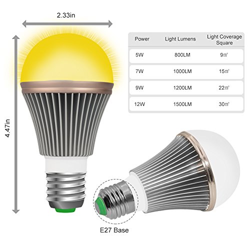 Product Specification: Rated Voltage: AC85-265V Lampshade Material: Aluminum Lamp Base: E26 E27 Gross Weight: 100g Light coverage diameter: 9 m² (5W) Light Lumen: 800LM Color temperature: 2000K Light Color: Amber Yellow Life Time : 25,000 hours above Heat temperature:56-58 degree.