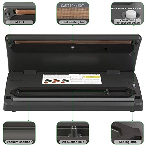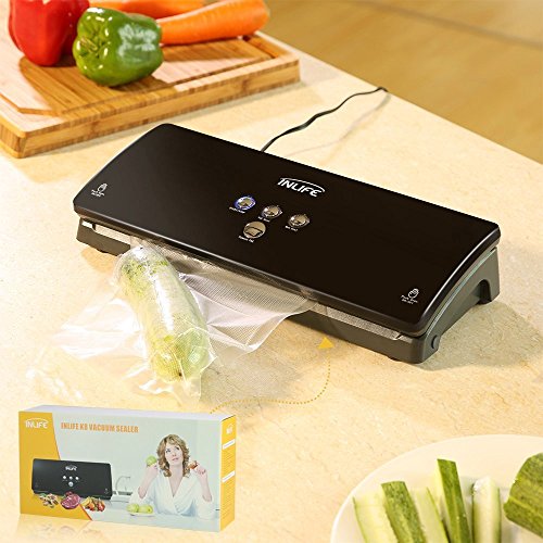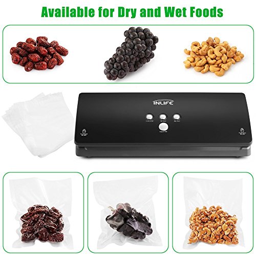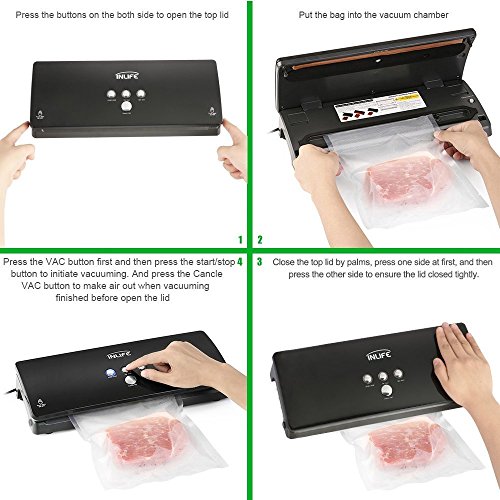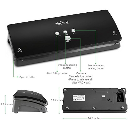 You can use INLIFE automatic vacuum to seal dry and moist foods, salads, soups, apple sauces, tomatoes, beans, documents, books, jewelry, and other valuables. Vacuum bags will increase the lifespan of your groceries and homemade dishes. Imagine that meat in your home can be stayed fresh 6 times when takes vacuum seal than ordinary storage. Cheese will keep 16 times longer when vacuum seal than conventional storage. And sugar can also keep fresh for up to 4 times longer. What a nice surprise 4 working modes: - Vac seal button for auto full vacuum seal - man seal button for auto seal only - half vacuum seal (press the vac seal button first and then press the start/stop button to control the degree of vacuum, finally press the man seal to finish the work.) - Air suction (use a tube to vacuum canning jars, box and canisters to keep supplies longer.) Features: -40kpa/-60kpa vacuum degree: Much stronger to decrease oxygen levels and seal faster than other models to keep out mold, bacteria, and moisture from your food and drink. Easy to use, durable and dirt-proof specification: - Product dimensions: 14.3 x 5.9 x 2.9inches - weight: About 1.5lb - product material: Abs, etc. - voltage: 100-240v ac - frequency: 50/60hz - power: 90w - vacuum degree: -40kpa/-60kpa - vacuum sealing operating time: 10-20s - non-vacuum sealing operating time: 6-15s - preservation material: Pa+pe package contents: • 1 x vacuum sealer • 1 x user manual • 2x bags as starter kit (6*10inches and 10*8inches) warm tip: •The width of the sealing film or the preservation bag can't exceed 12 inches, and it must be placed in the vacuum chamber.Feature
