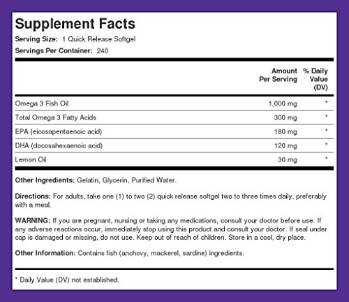 -. Binding : Health and Beauty -. Brand : Piping Rock Health Products -. Feature : Natural antioxidant for mind & heart** / Purified to eliminate mercury / Contains a high concentration of Omega-3 -. Label : Piping Rock Health Products -. Manufacturer : Piping Rock Health Products -. MPN : 903 -. NumberOfItems : 1 -. PackageQuantity : 1 -. PartNumber : 903 -. ProductGroup : Health and Beauty -. ProductTypeName : HEALTH_PERSONAL_CARE -. Publisher : Piping Rock Health Products -. Studio : Piping Rock Health Products -. Title : Omega-3 Fish Oil 1000 mg Lemon Flavor 240 Softgels
