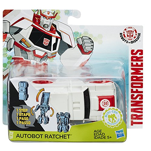 -. Feature : 1-Step Changers Autobot Ratchet figure / Changes from robot to vehicle and back in 1 step / Works with Mini-Con Weaponizers figures (each sold separately) / Scan the figure to unlock content in the Transformers: Robots in Disguise app / Unlocks Autobot Ratchet and a blaster in the app / Includes Autobot Ratchet figure