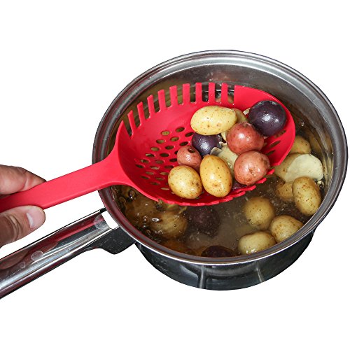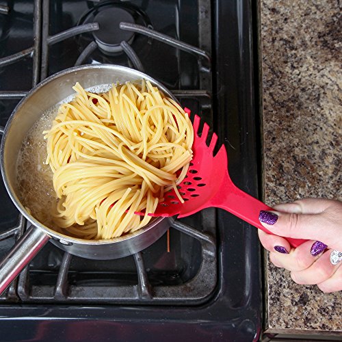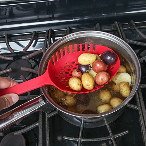 VERSATILE STRAINER SPOON: Large strainer spoon has forked sides and an extra-deep bowl for easy draining of long pasta, and the large size makes it ideal for lifting potatoes, vegetables and eggs from boiling water.