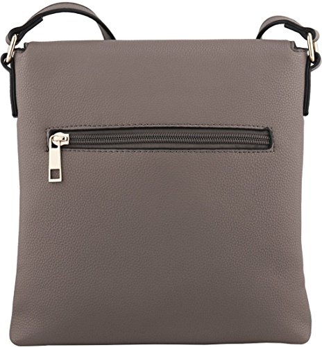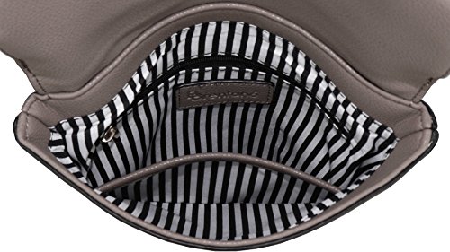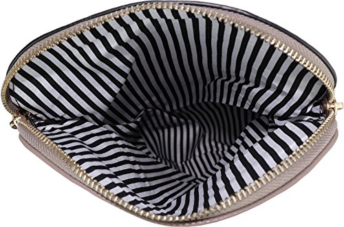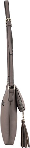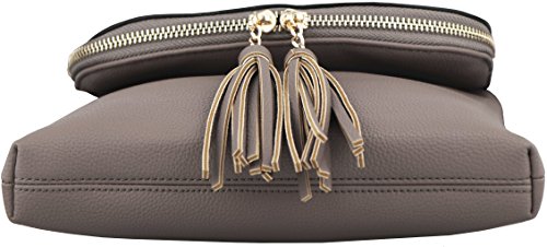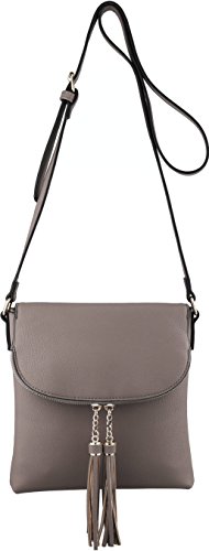 Fashion crossbody handbag that is made with faux leather with a black and white striped fabric lining. It has a zipper closure at the top of the flap which extends to the bottom of the purse that closes with a magnetic clasp. There are three other pockets: one zipper pocket on the back side of the purse, one pocket in the lining and a zipper pocket inside of the purse. There are tassel accents on the zipper on the flap.