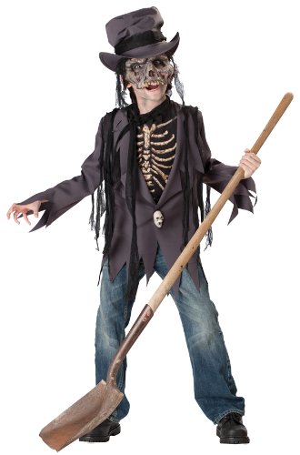 Product DescriptionJacket, detachable gauze strips, gauze scarf, skull button, dickie with skeleton print, vinyl mask and hat. Shovel, pants and makeup not included. Child size 12.0