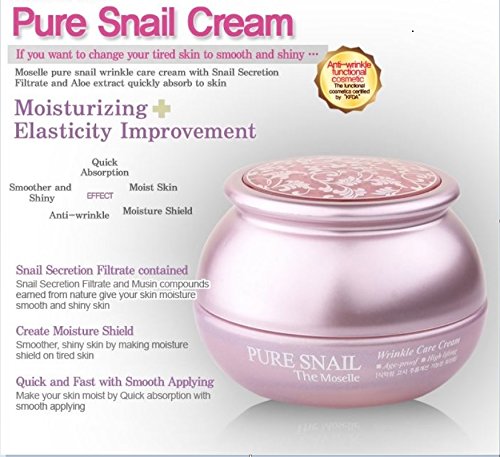 -. Feature : A deluxe repairing cream that protects and gives hydration to dry and rough skin, pure Snail Secretion Filtrate helps your skin to stay healthy and shiny. / Snail slime - or, technically, Helix Aspersa Müller Glycoconjugates - is a complex mix of proteins, glycolic acids and elastin that nature developed as a way to protect snail skin from damage of rocks, twigs, and other rough surfaces; infection, and UV rays. The snail extract is renowned for its regenerative properties, and facilitates the restoration of damaged tissue and replenishes moisture in skin. It is also effective in treating acne and scarring. Makes your skin moist by quick absorption of the natural cream ingredients.