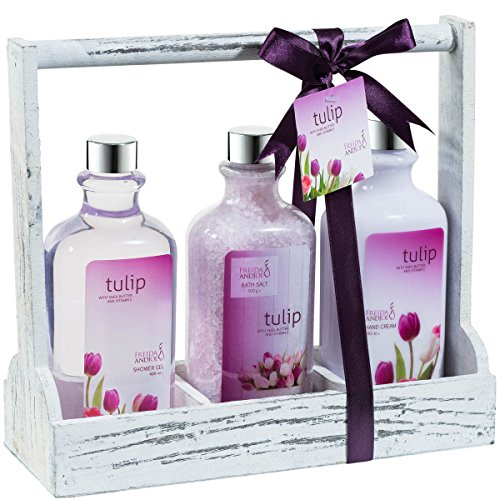 -. Title : Tulip! Bath and Body Gift Set - shower gel,bath salts,hand cream displayed in distress white wooden three sectional caddy