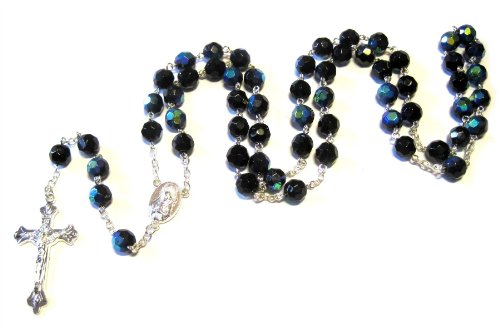 Silver Plated Necklace Rosary Crystal Black Glass Beads & Jesus Crucifix and Jerusalem Cross