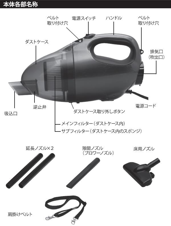 ブロワー(送風)機能付きで吹き掃除もできます。延長ノズル・隙間ノズル・床用ノズル等の多彩なアタッチメントで、様々な場所のお掃除ができます