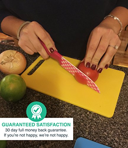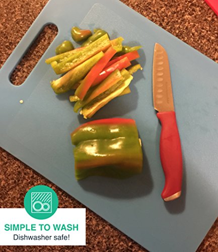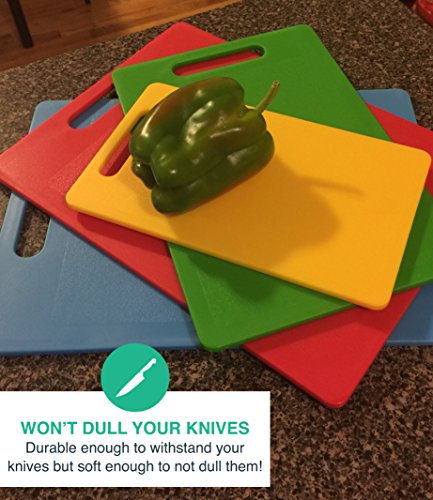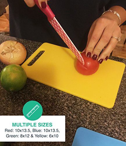 - MULTIPLE SIZES! No one needs to cut a lemon on a massive cutting board, and no one wants to cut a turkey on a tiny cutting board, that's why we provide you with this set so you can cut foods of all shapes and sizes! This set comes with 4 cutting boards, red - 10x13.5, blue - 10x13.5, green - 8x12, & yellow - 6x10.
