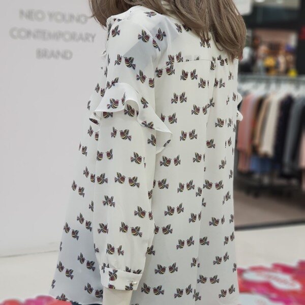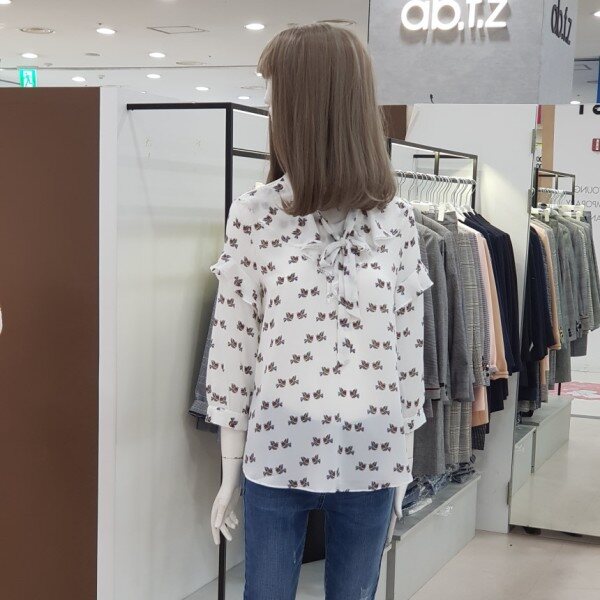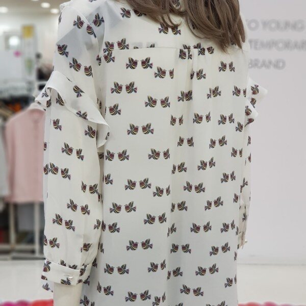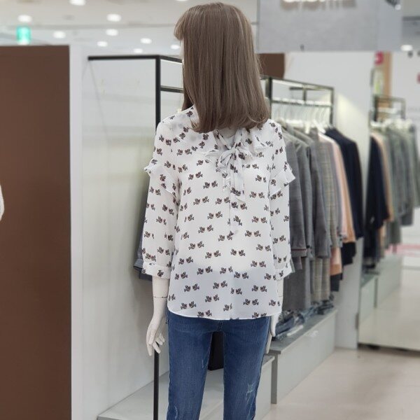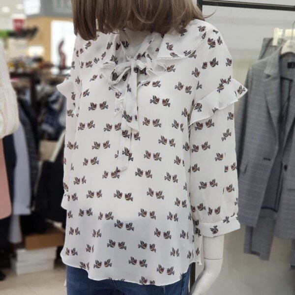여성스럽고 사랑스러운 분위기의 블라우스입니다.과하지 않은 프릴과 아기자기한 버드 패턴으로 데일리하게 입기 좋은 상품입니다.