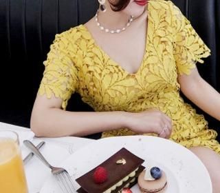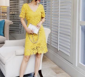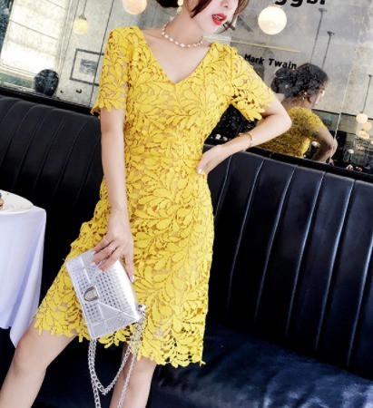 パーティードレス ひざ丈 ワンピース イエロー 花柄レース シースルー 透け感 半袖 上品 大人 お呼ばれ drgz2651