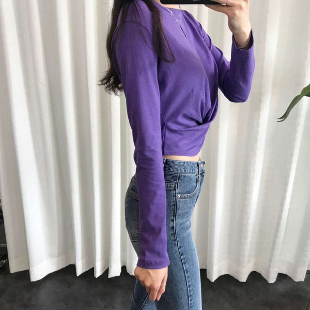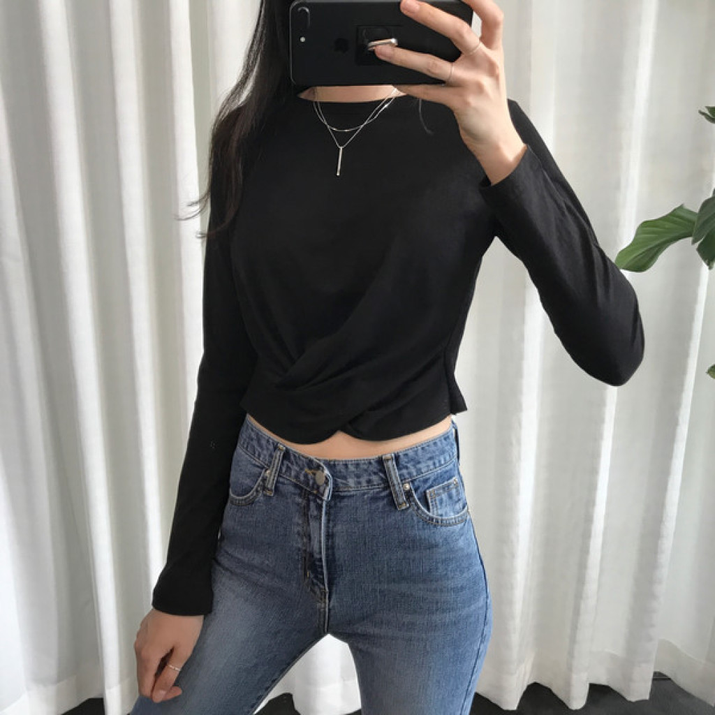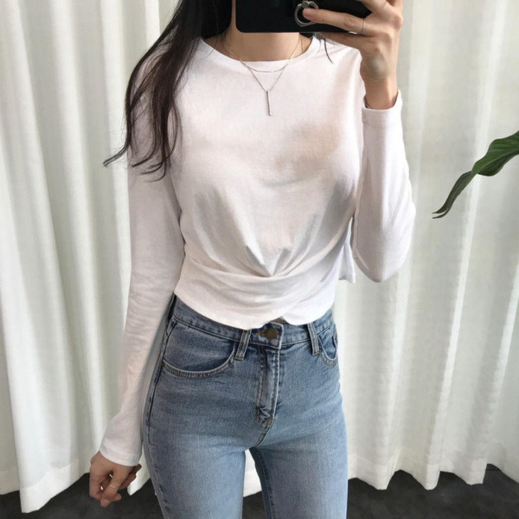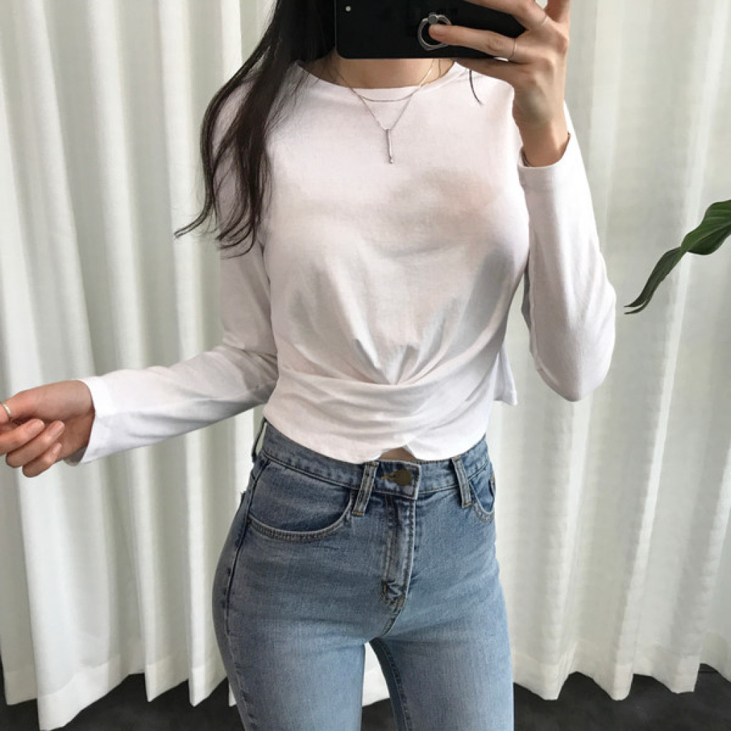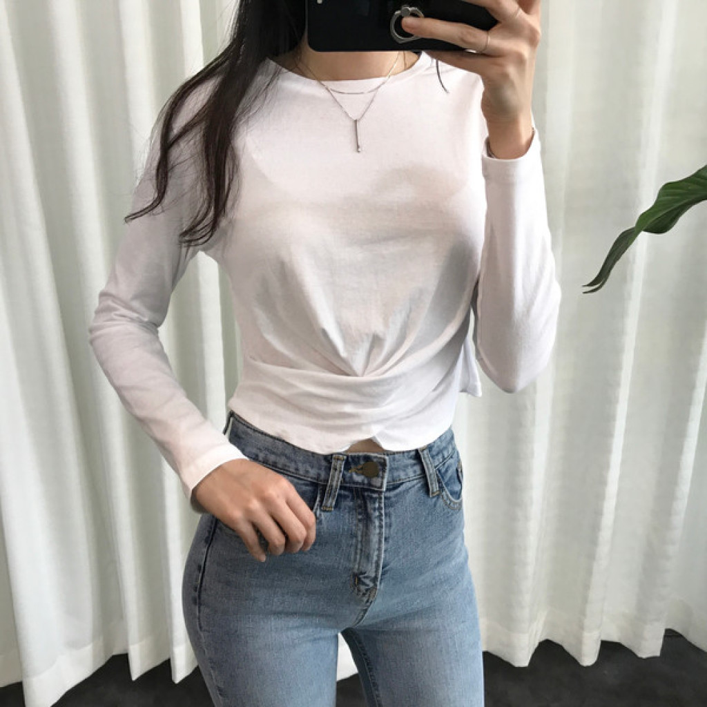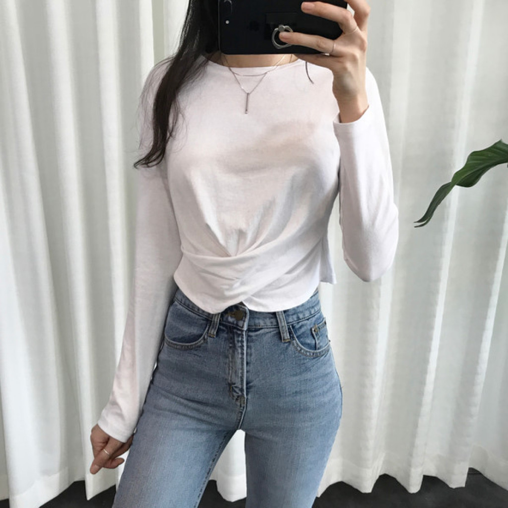 티셔츠 정면 밑단에 크로스로 꼬임