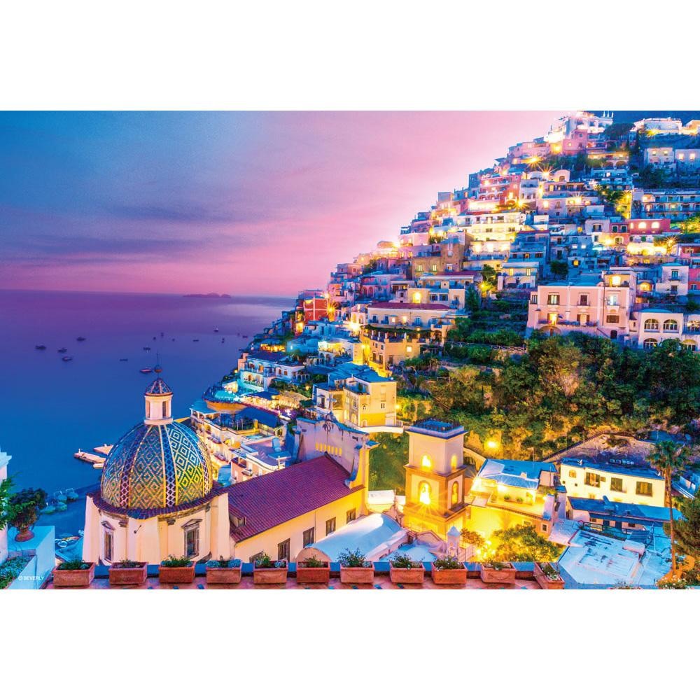 水平線に夕陽が沈み、カラフルな町に明かりが灯り始める(イタリア)。美しい絵画のような情景をジグソーパズルでお楽しみください。完成サイズ「38×26cm」とコンパクトなので、場所を取らずに1000ピースのパズルを楽しむことができます。 |