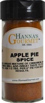 -. Binding : Misc. -. Brand : HANNA'S GOURMET -. EAN : 0070007500124 -. Feature : Comes in 4 fl. oz. glass jar / 100% NATURAL / 100% PURE / STAR K CERTIFIED -. Label : JR SPICE CO -. Manufacturer : JR SPICE CO -. PackageQuantity : 1 -. ProductGroup : Grocery -. ProductTypeName : GROCERY -. Publisher : JR SPICE CO -. Studio : JR SPICE CO -. Title : APPLE PIE SPICE -. UPC : 070007500124
